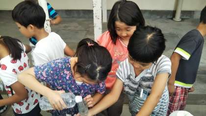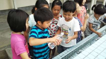 今日は、ペットボトルに水を入れて、1dLますに移し替えて、ペットボトルに入っている水のかさを調べました。基本、500mlのペットボトルを使いましたが、夏限定の600ml入るペットボトルもあり、子どもたちからは