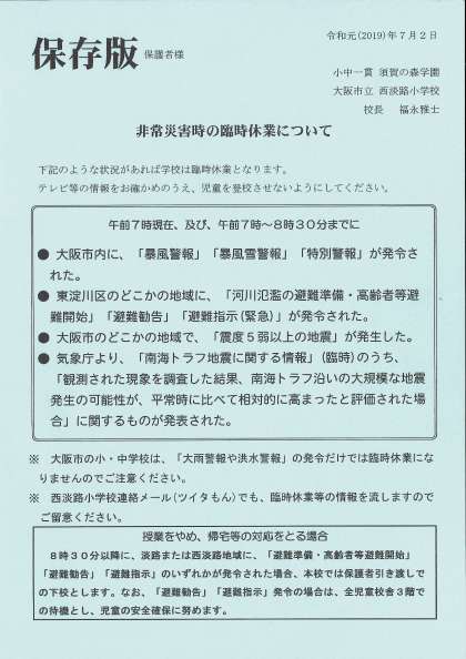 7月3日19時時点で、大阪市に大雨警報が出ております。今後の気象情報には十分ご注意いただきますよう、よろしくお願いいたします。なお、昨日、『非常災害時の臨時休業について』の手紙を配付しましたので、ご参照ください。