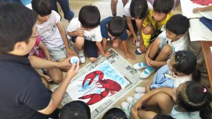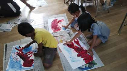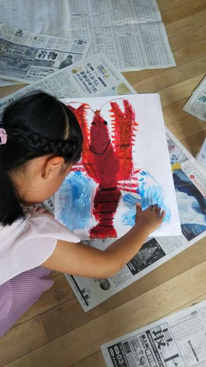 絵の具を使って色をつけていきますが、単に筆で塗るのではなく、絵の具を洗濯のりと混ぜ合わせたものを、手で直接画用紙の上にのばしていきます。そうすることで、何ともいえない味のある模様が背景となり、ザリガニの絵が一層映えます。