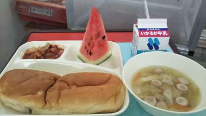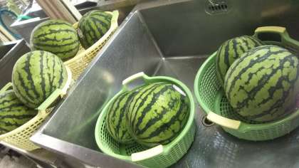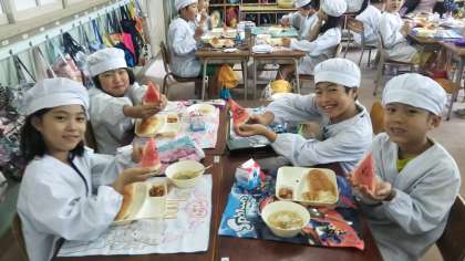 まんまるに大きく育った「すいか」が8玉納品され、それを給食調理員さんが1/64にカットして給食に出してくれますが、1つの「すいか」を形を崩さずに1/64ずつに切り分け、それが8玉…。とても大変な作業ですが、見た目もきれいに切り分けていただき、子どもたちも嬉しそうにいただきました!