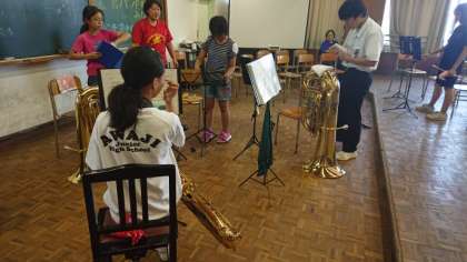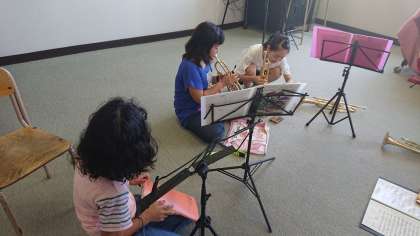 まず、先輩たちにお手本の演奏をしてもらい、そのあとパートごとに分かれての個別レッスン。少し緊張しましたが、音の出し方やチューニングの仕方を優しく教えてもらい、子どもたちはとても嬉しかったようです!