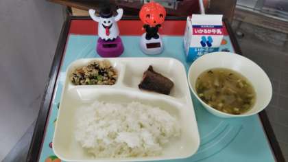 今日は和風の献立で、高野豆腐の炒り煮はお家でもあまり食卓にあがらないおかずかもしれませんが、豚のひき肉やひじき、にんじん、グリンピースと高野豆腐を合わせて栄養満点!和風の出汁がご飯にぴったりと合うおかずでした!