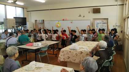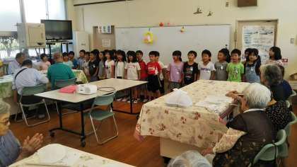 月に1回、本校の家庭科室で行われている、地域高齢者の方々への食事サービスの場に、1年1組の子どもたちが歌とダンスを披露しに行きました。