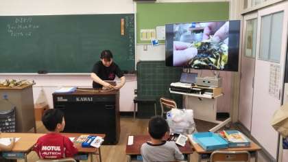 背の高いひまわりですので、花の中をじっくりと観察することはできなかったのですが、先生がタブレットと大型ディスプレイを使って、拡大された花の中を観察しました。