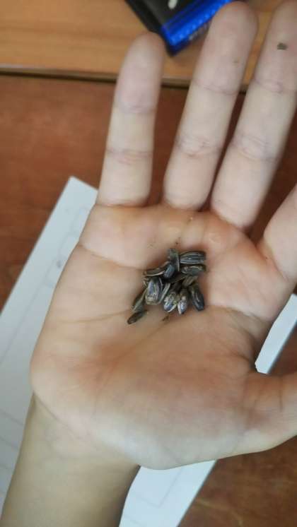 そのあと、各班で実際にひまわりを手に取って観察し、種も収穫しました。