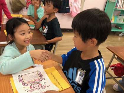 突然の2年生の訪問に、1年生の子どもたちは驚きつつも、招待状を1人1人手渡しされると、照れくさそうににっこり!