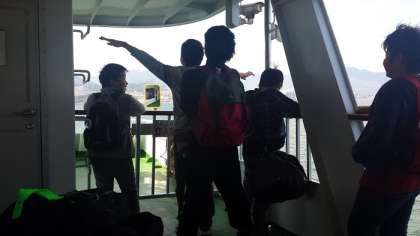 フェリーを待つ間、心なしか疲れ気味かな・・、子どもたちも先生も・・・。