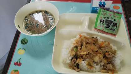 ピリ辛どんぶりは豚肉を使ったどんぶりで、味付けにしょうが、にんにく、豆板醤を使った「ピリ辛」のどんぶりです。かくし味に赤みそが使われており、ごはんのすすむメニューで、子どもたちからも