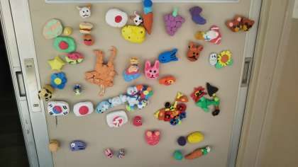 紙粘土でマグネットの付いたマスコットを作っている2年生。