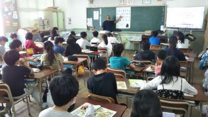今日は普段5・6年生の外国語を教えているチャタジー先生が、4年生の外国語活動の指導に来てくれました。