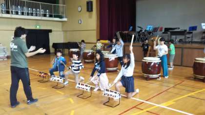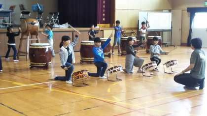ドコドコドンに向けての練習、4年生は今日初めて、本物の太鼓を使って“初打ち”を行いました。