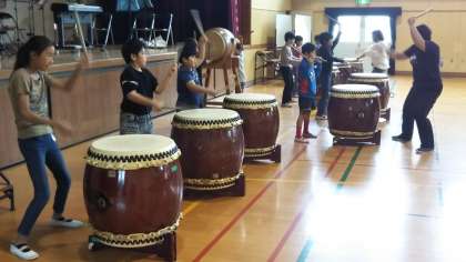 たたき始めると、まじかで聞こえてくる太鼓の響きに圧倒されながらも、真剣な表情でバチを振り下ろしていました。