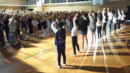 体を動かして、心身ともに目覚めさせ、1日元気な声が出るようにするための朝会です。