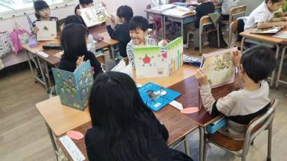 西淡路小学校では、1時間目が始まるまでの時間や図書の時間などを使って、子どもたちが本を手に取る機会を多くする取り組みを行っています。