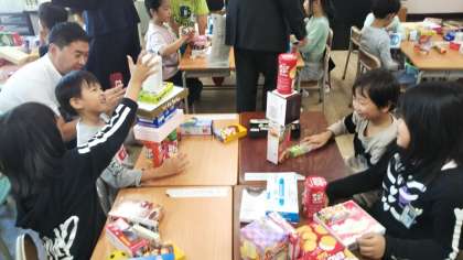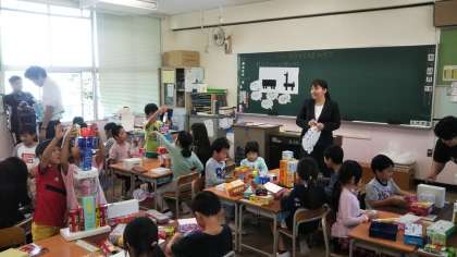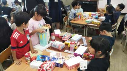 今日の学習単元は「かたちあそび」で、お家から持ってきた形も大きさも様々な空き箱の特徴を生かして形をつくることを目標としています。