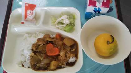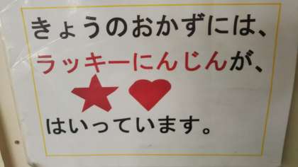 今日のカレーには星形やハート形の「ラッキーにんじん」が、各学級の食缶に何個か入っています。子どもたちが喜んでくれるように…と、調理員さんの心遣いと愛情が込められています。