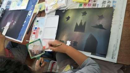「スパッタリング」とは、絵の具を目の細かな網に塗り、ブラシでこすることで絵の具の小さな粒子を画用紙の上に飛ばす手法です。型紙を置いた上から絵の具の粒子を吹きつけることで、筆だけでは表現できない雰囲気のある作品をつくることができます。