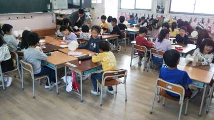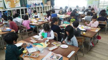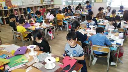 1年生の図画工作の時間は、紙コップ、紙皿を使った作品づくりをしています。