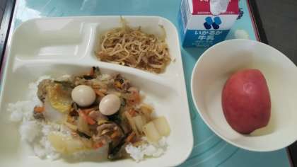 中華丼は、子どもたちに人気のメニューです。隠し味のしょうがが食欲をそそります。ボリュームはありますが食べやすく、早く食べ終えた子も多かったようです。