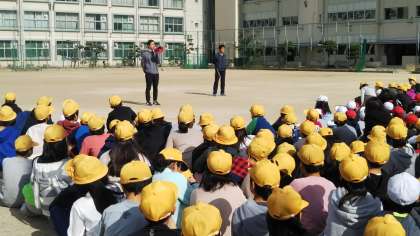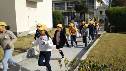 地震の発生、それに伴う校内での火災の発生を想定し、西淡路小学校の校庭から淡路中学校の校庭に避難を行うというものです。