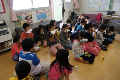 歯をきれいにした後、保健室でフッ化物の塗布を行いました。しばらく、口に薬剤のついたものを加えてじっと待ちます。