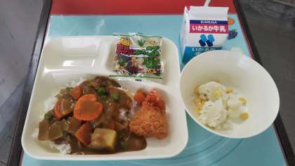 「エビフライカレーライス」は入学お祝い献立でよく出る献立ですが、今年は4月に「カツカレーライス」が提供されたため、11月に登場です!