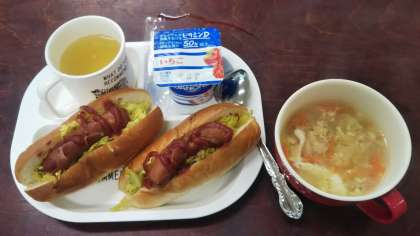 今日の朝ごはんやさんのメニューは、ボリューム満点のホットドッグとかき玉スープ、ヨーグルトです。