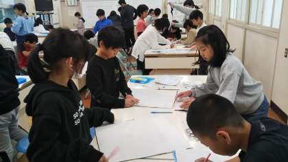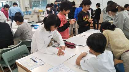 今日は裁縫道具の扱い方や作業台の使い方など、基本的なことをおさらいした後、1人1人が希望した模様の布地にチャコペンで印をつけていきました。次の時間からはいよいよミシンを使った学習に入っていきます。