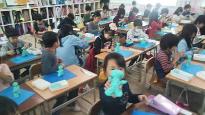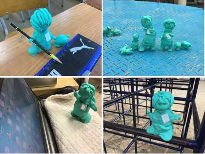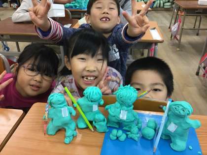 1年生は図画工作の時間に「いっしょにおさんぽ」というテーマで、おさんぽに行く自分を油ねん土でつくっています。