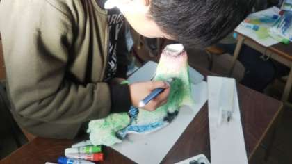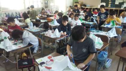 作品展にむけての取り組み、4年生は先週行った液体ねん土の型取りが終わり、今日は液体ねん土でかちかちに固まったタオルに着色をしていきます。1人1人の型が違い、見るからにユニークなものができそうです!色をつけることで、子どもたちのイメージが徐々に分かるようになってきました。活動はまだまだ前半、これからどんなものができるか楽しみです!