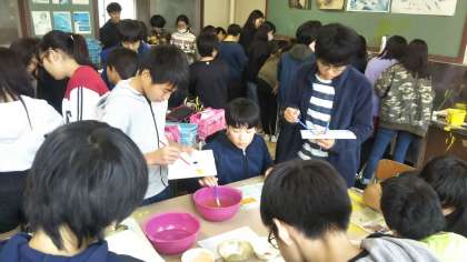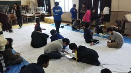 6年生が制作している「キッズゲルニカ」は下がきが終わり、今日から活動場所を淡路中学校に移して、着色の活動に入りました。
