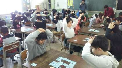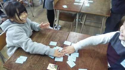2人1組になって、担任の先生が上の句を読み上げ、下の句の字札を2人で取り合います。