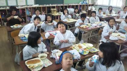 給食の時間、2年1組の教室をのぞいてみると、見慣れない子ども(?)、転入生(?)、が児童席に座って給食を食べています…。よーく見てみると、その正体は…。