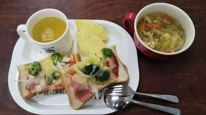 たくさんの具材をのせ、ボランティアの方々が一枚ずつ焼き上げ、あつあつを子どもたちに提供してくださいます。具だくさんのスープ、パイナップルも添えていただき、色どりもきれいです。