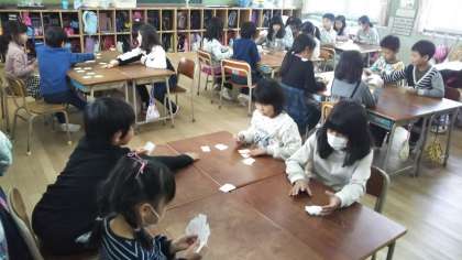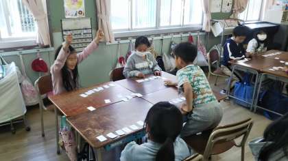 今日はこの「春の七草」を身近に感じてもらうため、カードを使った簡単なゲームをしました。4人1組になり、だれが一番早く「春の七草」のカードを集めることができるか…、というものです。子どもたちは楽しく活動しながら、「春の七草」の名前にふれることができました。