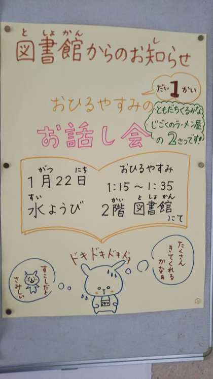 支援員の方が「ともだちくるかな」と「じごくのラーメン屋」の2冊の本の読み聞かせをしてくださいました。