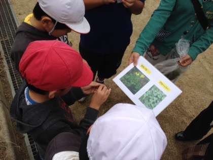 シニア大学校の方に来ていただいて、校庭の木々や草花を使って自然観察会を行いました。