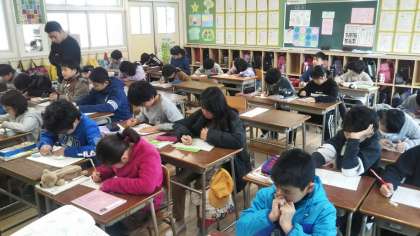 今日、全員の作品が出そろい、黒板に掲示して、各自が印象に残った3句を選び、なぜ印象に残ったのかをプリントに書いていきます。