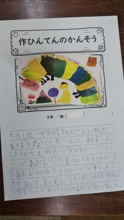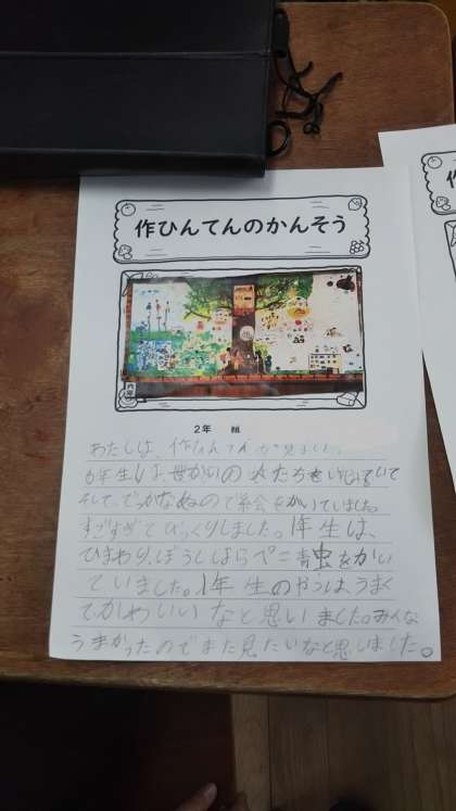 2年生では、作品展の鑑賞後、特に印象に残った作品について、何がよかったのか、どんなところがすごいと感じたのかなど感想を書いて学習のまとめをしています。