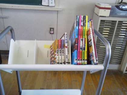 高学年は、ブックトークで本の紹介もしてもらいました。事前に図書館から紹介する本を借りてくださり、子ども達がすぐに手に取り読めるように準備もしていただきました。写真のブックトラックは、校長戦略予算で購入したもので、紹介していただいた本を教室へ運ぶのに活躍しました。