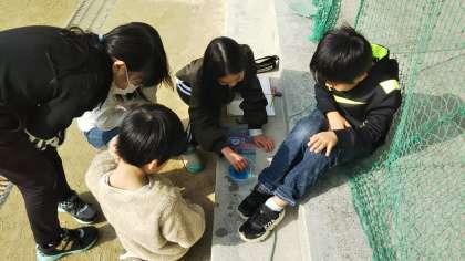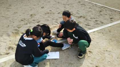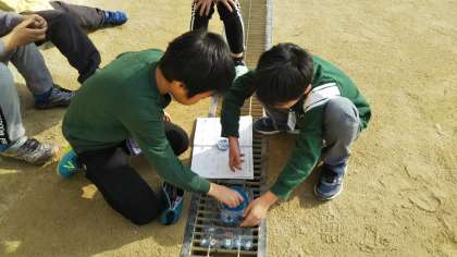 今日は、運動場でじしゃくを使って、じしゃくのきょくがどの方位を示すのかを実験しました。