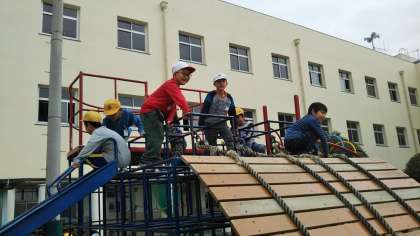 遊具で遊んでいる子やバスケットをしている子、先生とすもうをとっている子もいましたよ!