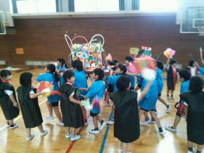 それぞれのクラスでつくったおみこしを担いで入場です。