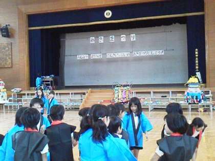 みんなで歌を歌って盛り上げ、1・2年生がペアになってゲームコーナーとしおりづくりのコーナーをまわります。