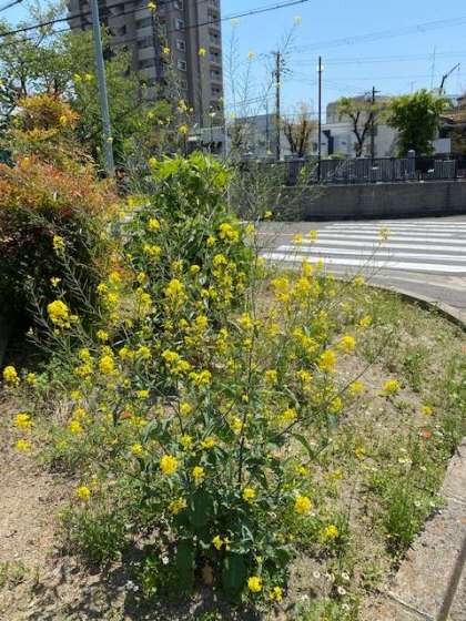 アブラナは西淡路小学校と淡路中学校の間にある花壇にもたくさん咲いていました。学習プリントや教科書の写真と、西淡路小学校のアブラナを見比べてみましょう。