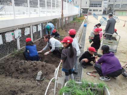翔館の利用者の方と職員の方が来てくださり、1年生と一緒に畑にムスカリを植えていきました。ほんわかとした交流の中で作業が進みました。