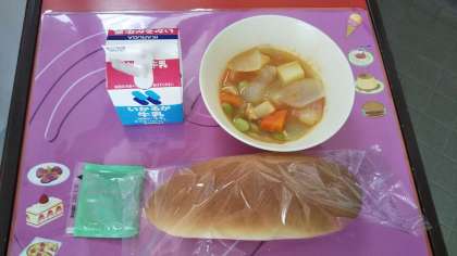 コッペパン 牛乳 フレッシュトマトのスープ煮 リンゴシャム