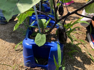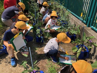 2年生は生活科の学習で実のなる植物を育て、観察しています。雨の日が続き、久しぶりの観察となったが、「先生、見て!!」と大きく成長した植物を見せてくれました。なすびやトマト、枝豆と次々に実をつけ始めました。自分で育てた野菜、子どもたちはどのようにたべるのでしょうか?