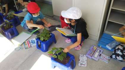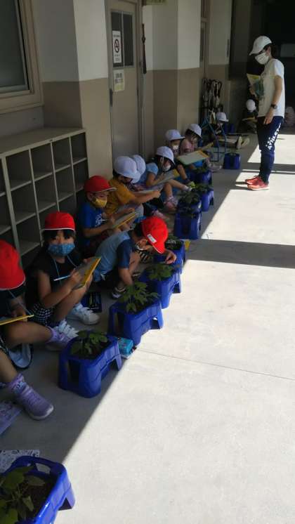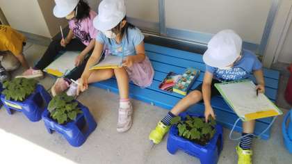 葉っぱの様子を絵で記録したり、葉っぱの感触やつるの伸び方などを観察しました。