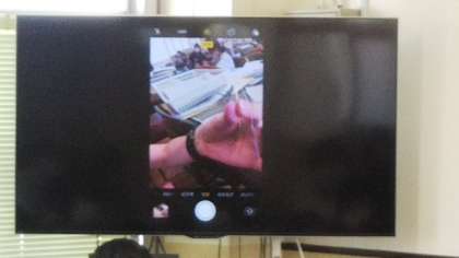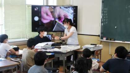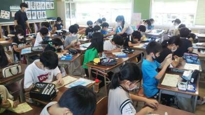 先生が教室の前にある大型ディスプレイを使って実際の手元の動きをお手本として画面に映し出すと、子どもたちもイメージが持ちやすくなり、頑張って“技”を習得することができました。